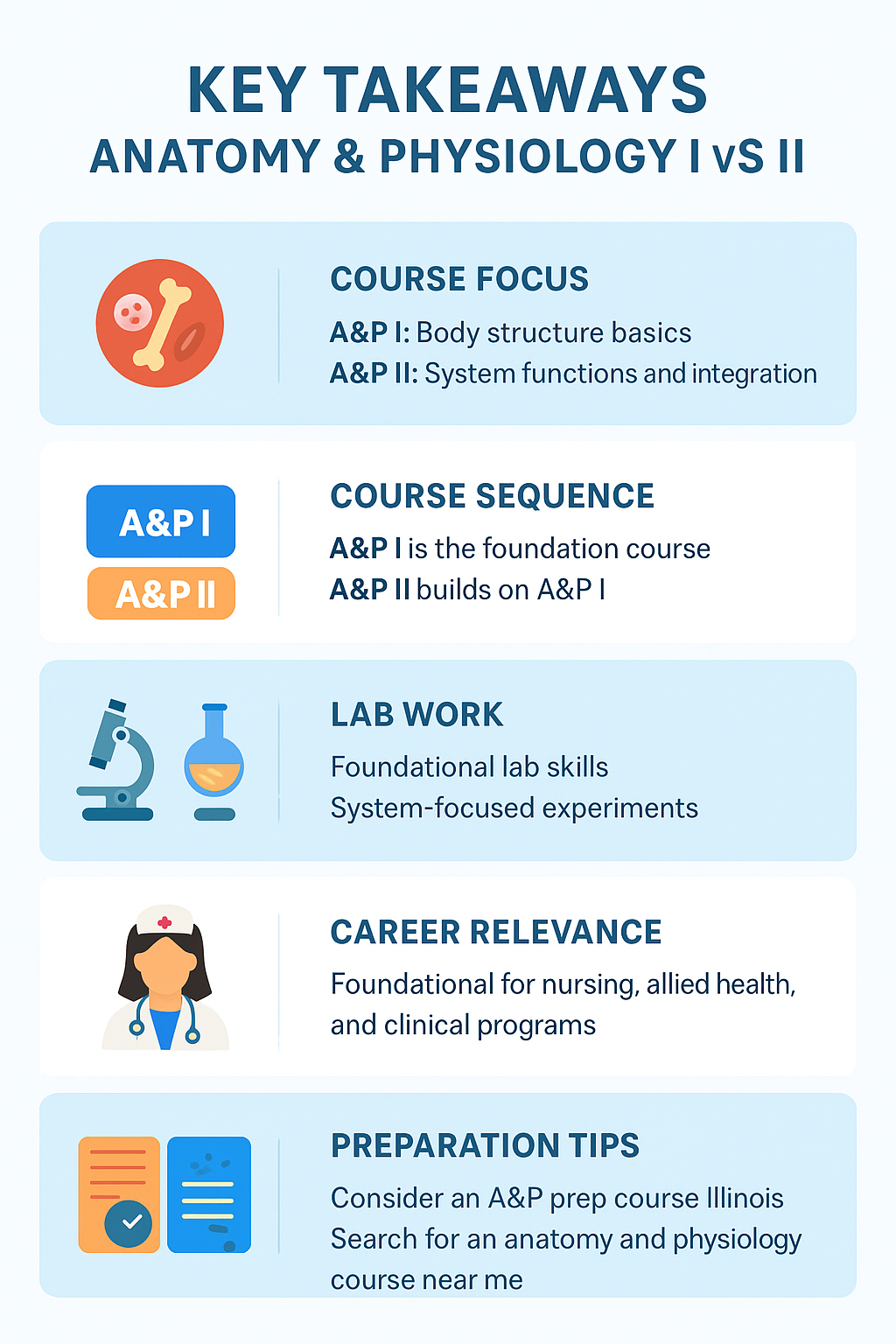 In short, A&P I teaches “what the body is,” while A&P II focuses on “how it works.” Understanding this distinction helps students plan their academic path effectively and ensures readiness for clinical applications.